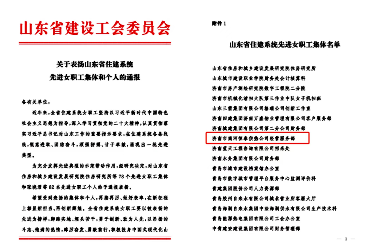 近日,山東省建設(shè)工會發(fā)布了《關(guān)于表揚(yáng)山東省住建系統(tǒng)先進(jìn)女職工集體和個人的通報》,濟(jì)南能源投資控股集團(tuán)商河恒泰供熱公司經(jīng)營服務(wù)部獲評“山東省住建系統(tǒng)先進(jìn)女職工集體”。
