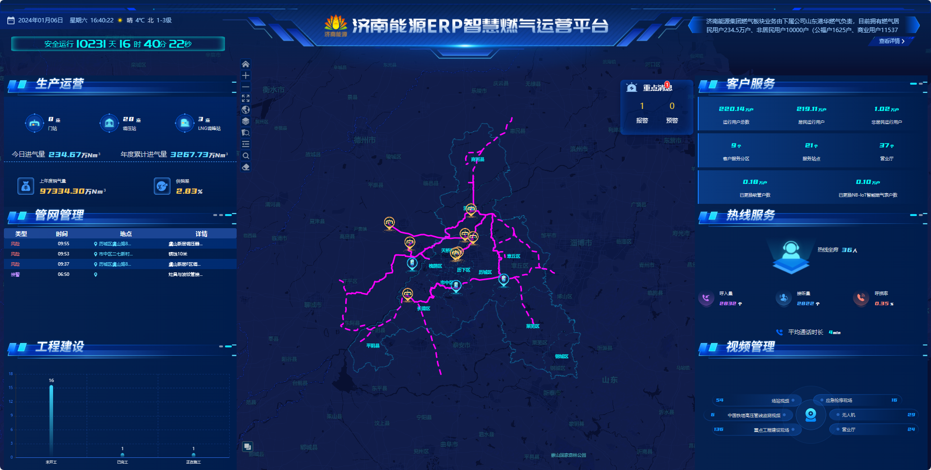 目前,濟南能源智慧燃氣運營平臺已經(jīng)將工程建設(shè)、通氣點火、安檢維修、管網(wǎng)巡檢等生產(chǎn)運營和服務(wù)全流程納入其中,一圖展示、一屏呈現(xiàn),通過自動化數(shù)據(jù)分析和智能監(jiān)控等手段,讓地下每根“毛細血管”都“清晰可見”,調(diào)度人員能實時掌握運行狀況,及時進行氣源調(diào)配,保障千家萬戶的用氣安全。