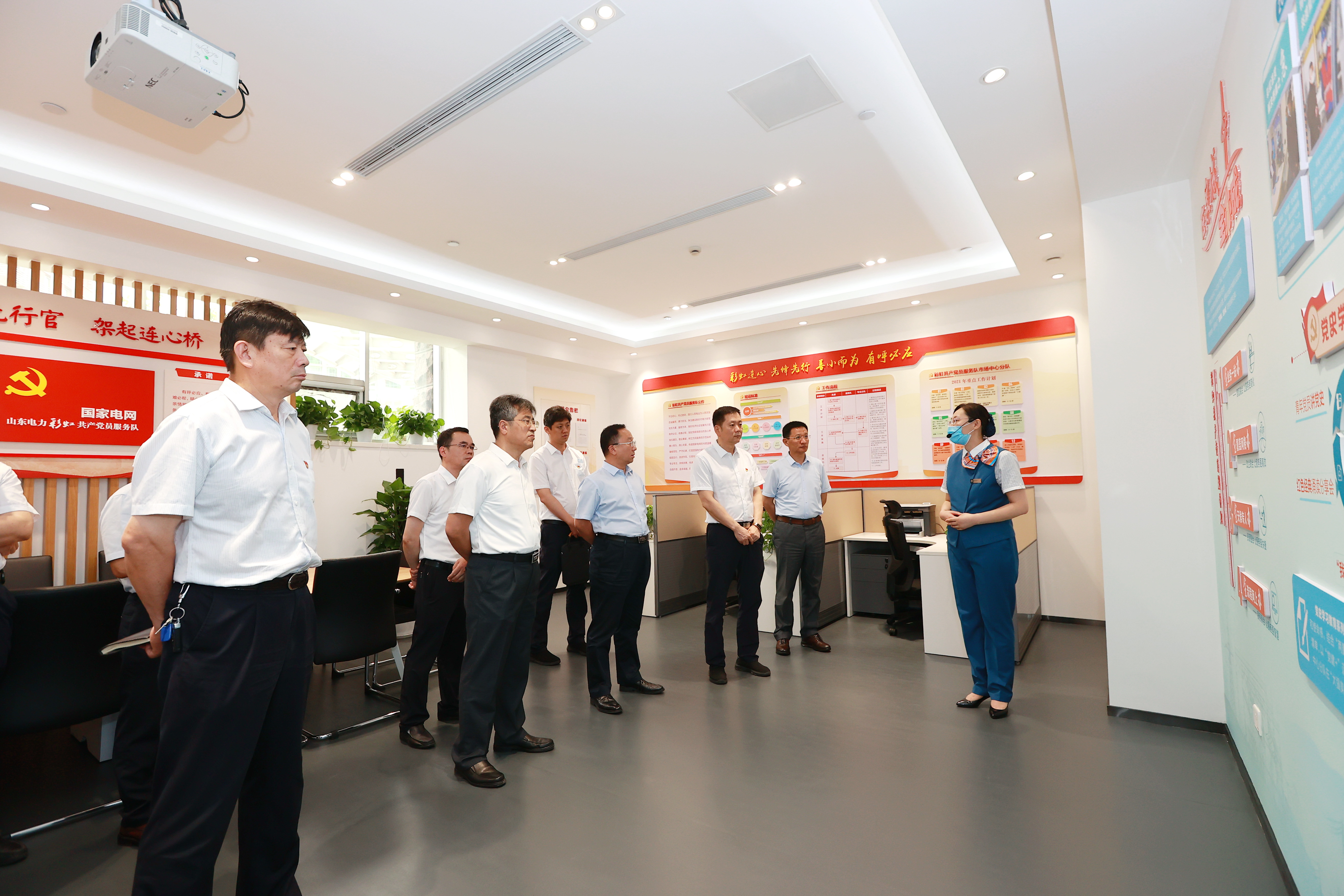 在中心營業(yè)廳,潘世英一行聽取了供電公司“刷臉辦電”業(yè)務(wù)流程、“網(wǎng)上國網(wǎng)”推廣應(yīng)用、綜合能源服務(wù)業(yè)務(wù)等情況介紹,觀看了“在泉城、全辦成”特色服務(wù)實(shí)踐專題片,并來到市場(chǎng)中心彩虹共產(chǎn)黨員服務(wù)分隊(duì),詳細(xì)了解黨員服務(wù)隊(duì)、責(zé)任區(qū)和示范崗建設(shè)情況。在供服中心,近距離體驗(yàn)保障客戶不停電、用好電、快復(fù)電等有效做法,直觀感受“工單驅(qū)動(dòng)業(yè)務(wù)”管控模式、故障自愈、統(tǒng)一指揮平臺(tái)建設(shè)等服務(wù)內(nèi)容。