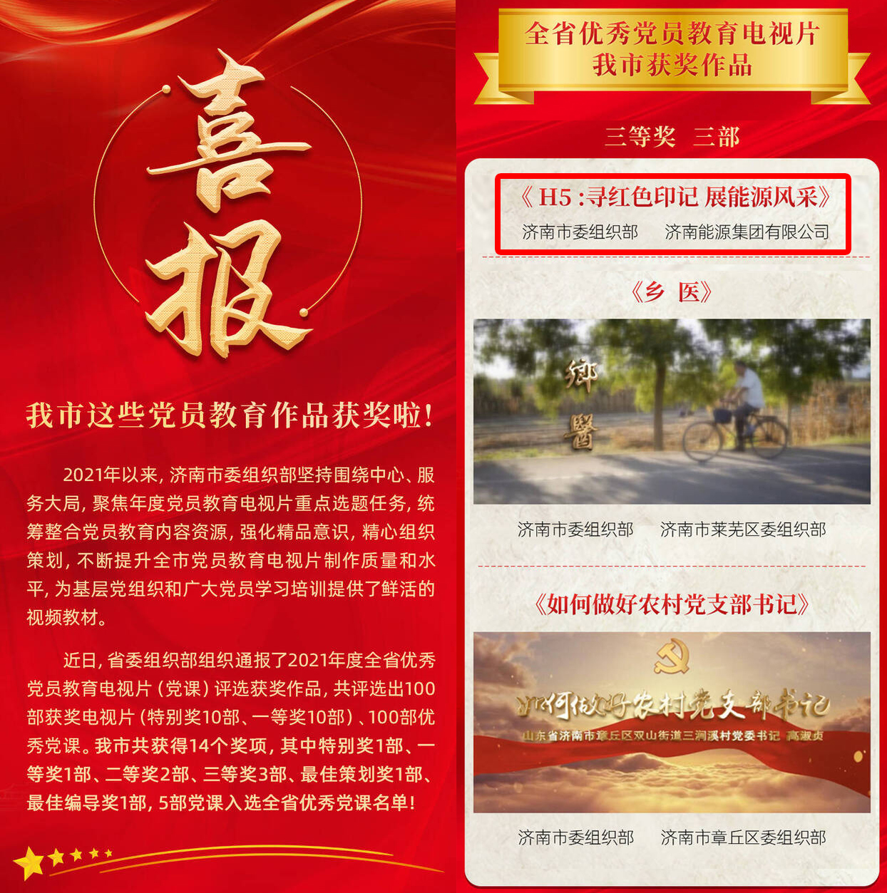 近日,山東省委組織部通報了2021年度全省優(yōu)秀黨員教育電視片(黨課)評選獲獎作品中,濟(jì)南能源集團(tuán)制作的微信小程序《尋紅色印記 展能源風(fēng)采》榮獲全省三等獎,這是濟(jì)南市唯一一家企業(yè)獲獎。同時,在市國資委與市廣播電視臺共同組織開展的“展國企風(fēng)采 樹時代先鋒”國企風(fēng)采視頻評選展播活動中,集團(tuán)制作的獻(xiàn)禮建黨100周年MV《紅船向未來》獲得“視頻最佳作品”獎,集體創(chuàng)意形象宣傳片《賦能城市生長》榮獲“視頻創(chuàng)意作品”獎,并將在濟(jì)南電視臺進(jìn)行展播,為慶祝建黨一百周年和黨史學(xué)習(xí)教育增添了濃墨重彩的一筆。