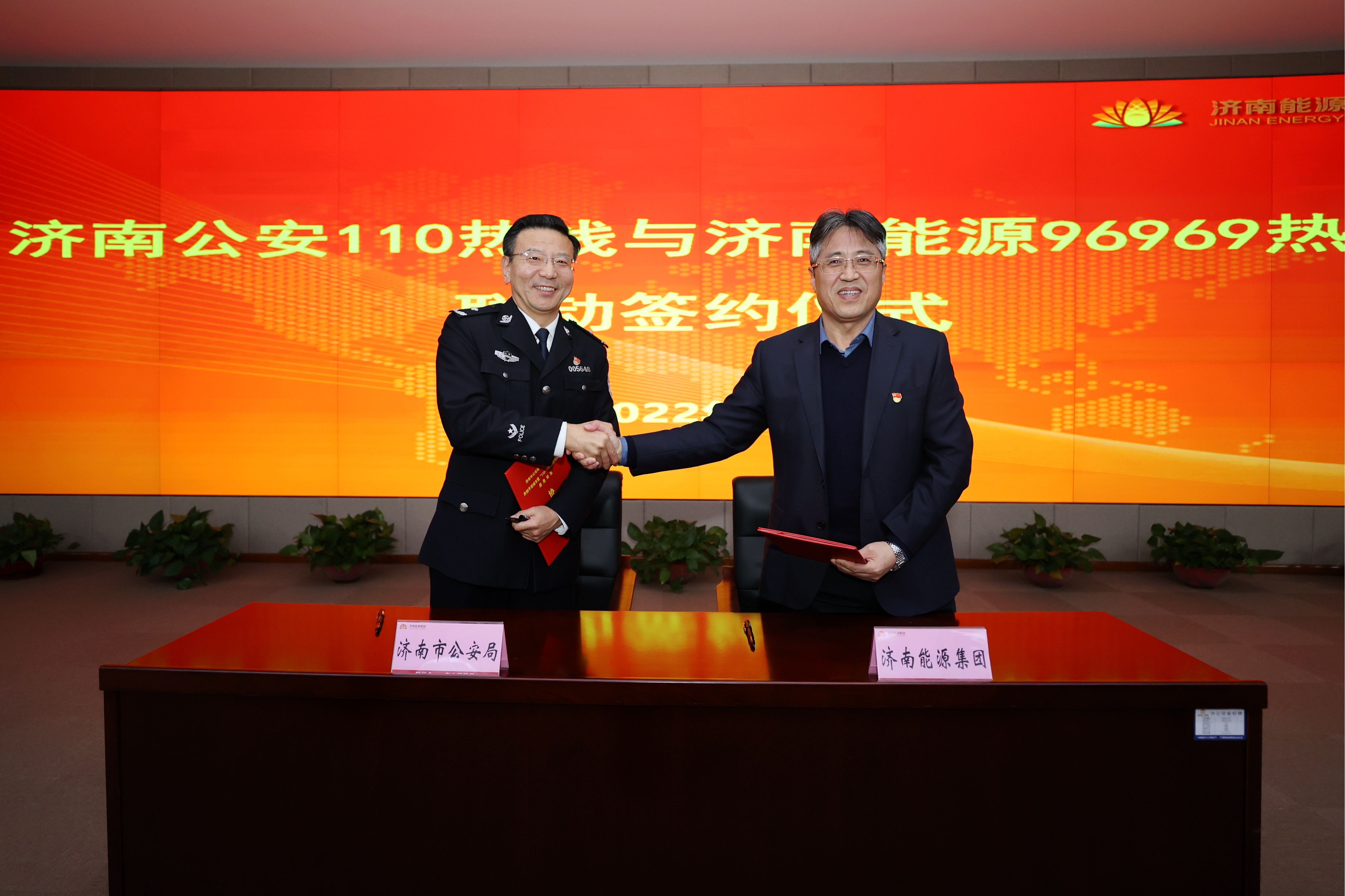 濟(jì)南能源集團(tuán)黨委副書(shū)記、總經(jīng)理劉衍波與濟(jì)南市公安局情指勤合成作戰(zhàn)中心主任林景代表雙方簽訂《濟(jì)南公安110熱線、濟(jì)南能源集團(tuán)96969熱線聯(lián)動(dòng)合作協(xié)議》。
