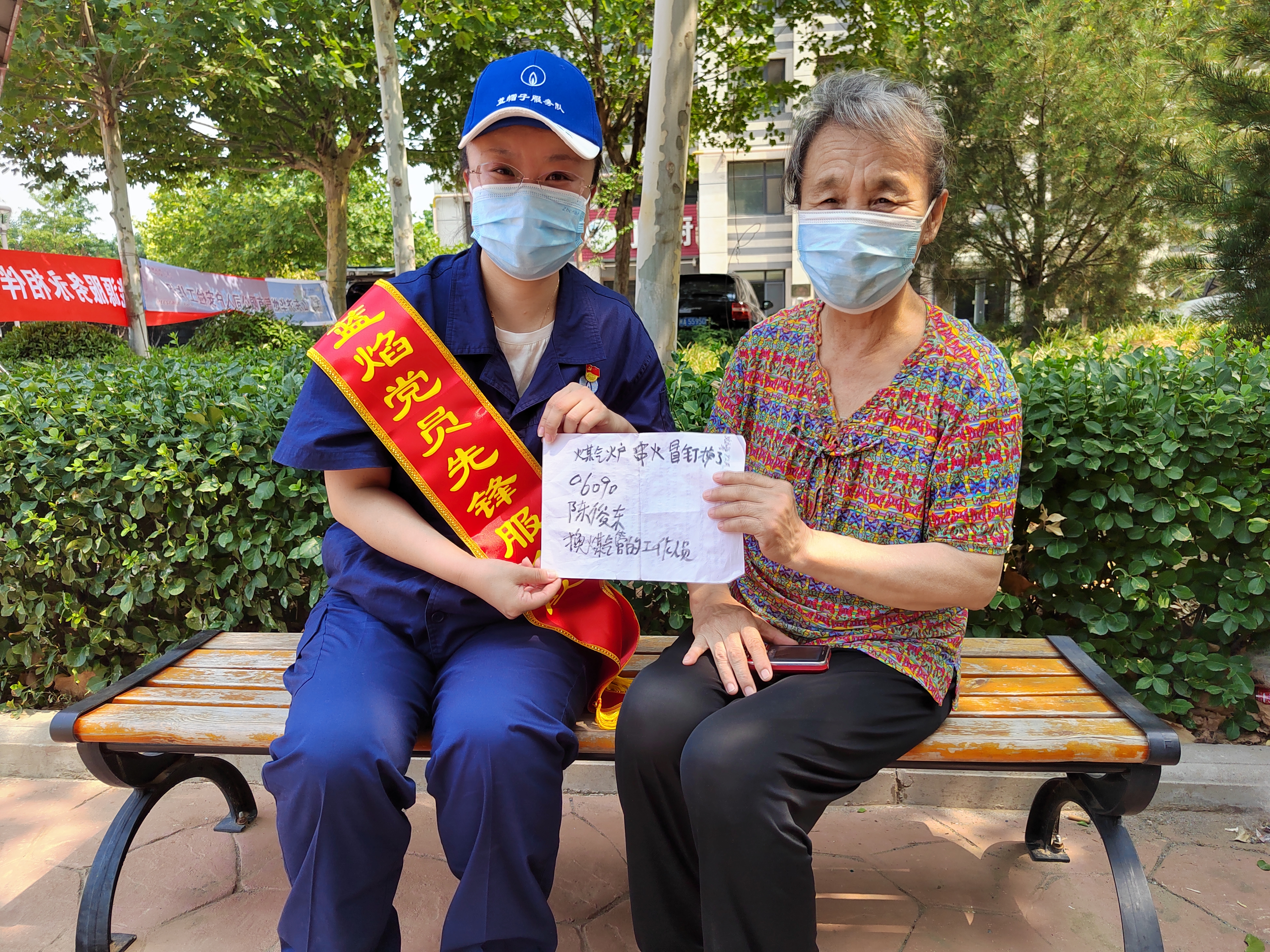 大娘聽后,遞出手里一直緊緊攥著的一張紙,上面寫著“煤氣爐(燃氣爐)串火鉚釘?shù)袅耍?6090陳俊東,換煤氣管(燃氣膠管)的工作人員”,“我要夸一夸你們的這個人,昨天到我家給換的軟管,爐子上的串火鉚釘?shù)袅?,也一起給修了。”大娘指著紙上的員工工號和名字,激動地解釋著,“天挺熱的,我給他拿了一瓶冰水,他沒敢喝,說他自己前一陣胃不舒服。”大娘邊說邊露出心疼的表情,并向黨員同志表示,感覺這些入戶的工作人員實在辛苦,就讓他留下了自己的名字和工號,找機會一定要向公司領(lǐng)導(dǎo)表揚一下他。