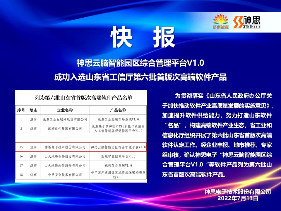 神思云腦智能園區(qū)綜合管理平臺(tái)V1.0成功入選山東省工信廳第六批首版次高端軟件產(chǎn)品