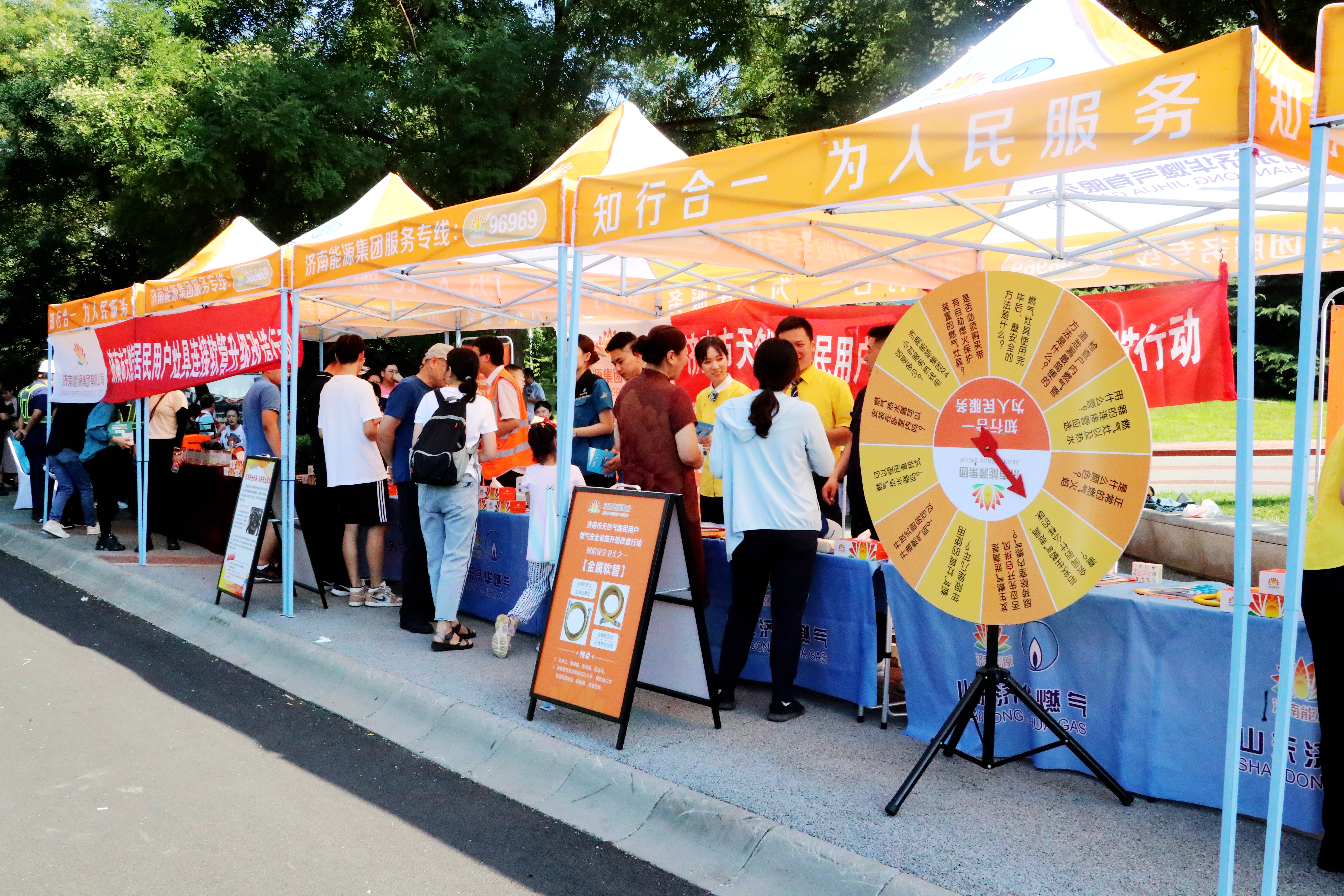 帳篷下,身穿橙色馬甲的工作人員站在宣傳咨詢臺(tái)前,抬頭微笑著,落落大方地招呼著前來(lái)咨詢的居民用戶們。