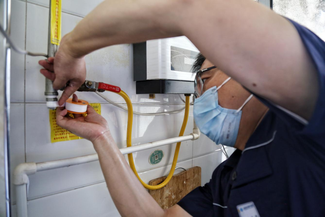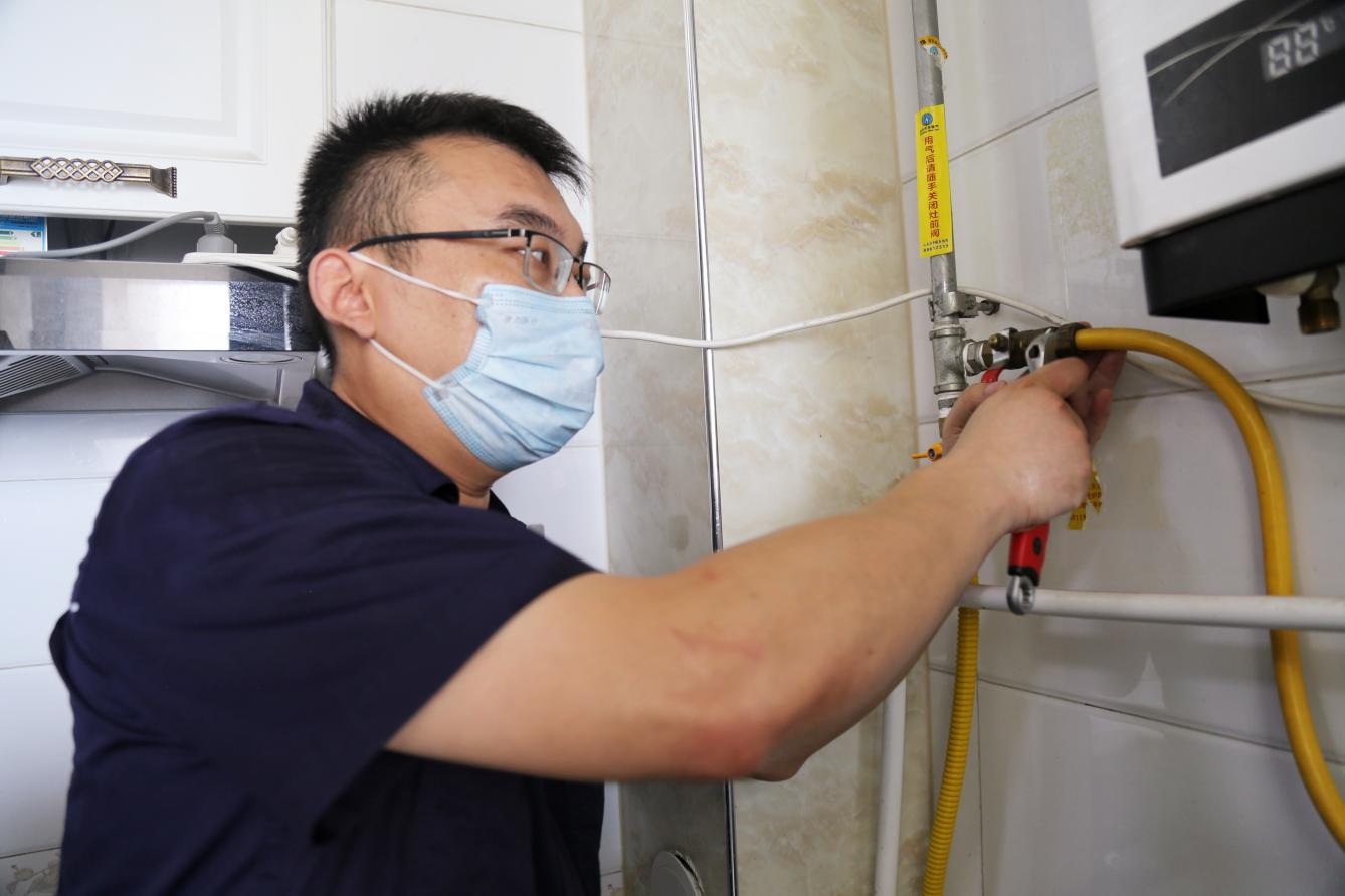 由于用戶的燃?xì)夤芫€都在櫥子深處,在更換金屬軟管時,苗興峰必須趴在櫥子里,精力也處于高度集中的狀態(tài)。更換結(jié)束后,他的身上幾乎已經(jīng)完全濕透了,深藍(lán)色的工作服隱隱透出里面短袖的輪廓,仿佛能擠出水來。