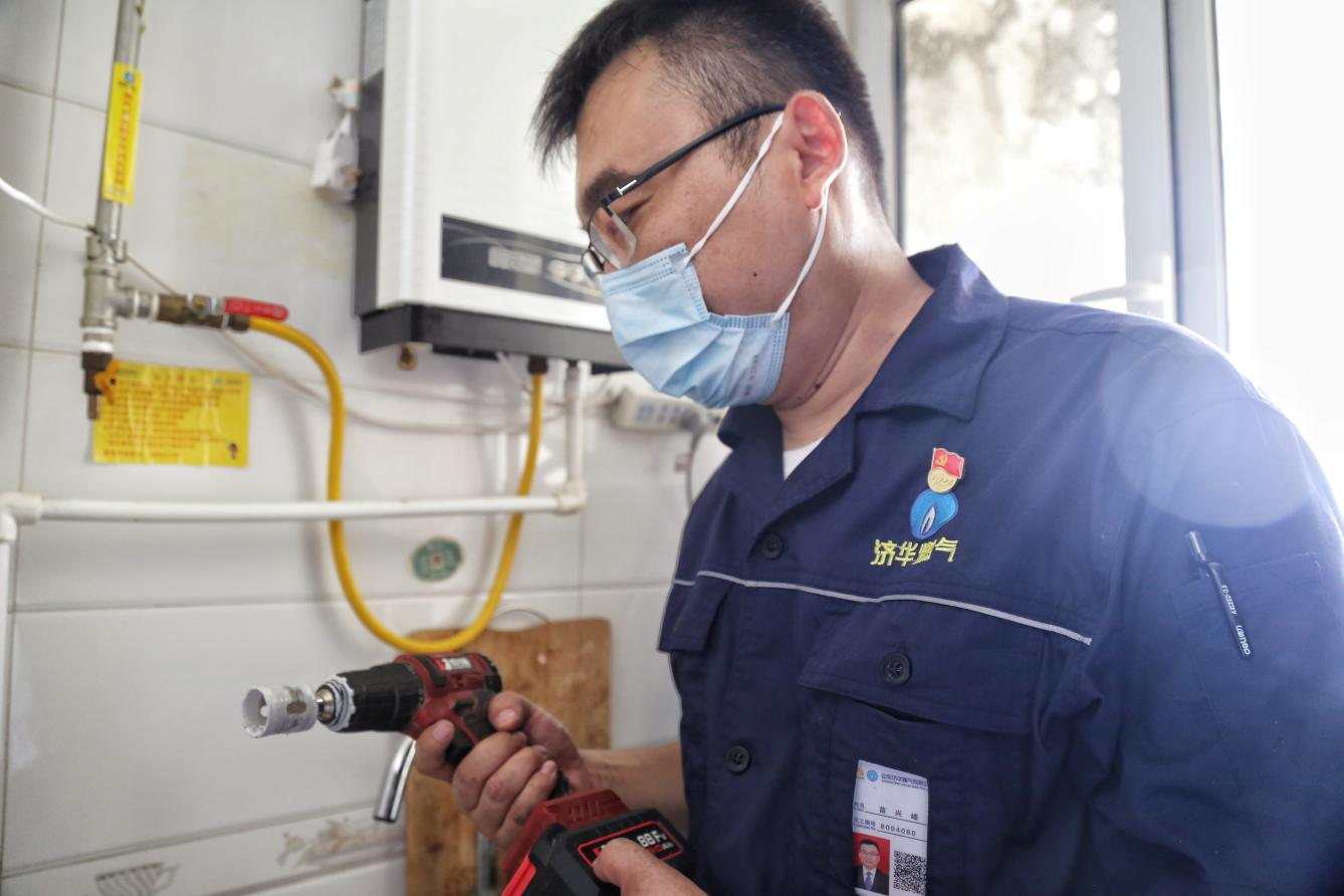 8月2日上午,在濟(jì)南槐蔭區(qū)粼湖居小區(qū)的一戶居民家中,苗興峰正在給居民更換燃?xì)廛浌埽鳛闈?jì)南能源集團(tuán)所屬山東濟(jì)華燃?xì)饪蛻舴?wù)西區(qū)負(fù)責(zé)人,一個多月以來,他都奮戰(zhàn)在燃?xì)?ldquo;敲門行動”的前線,為千家萬戶送去“安燃”。