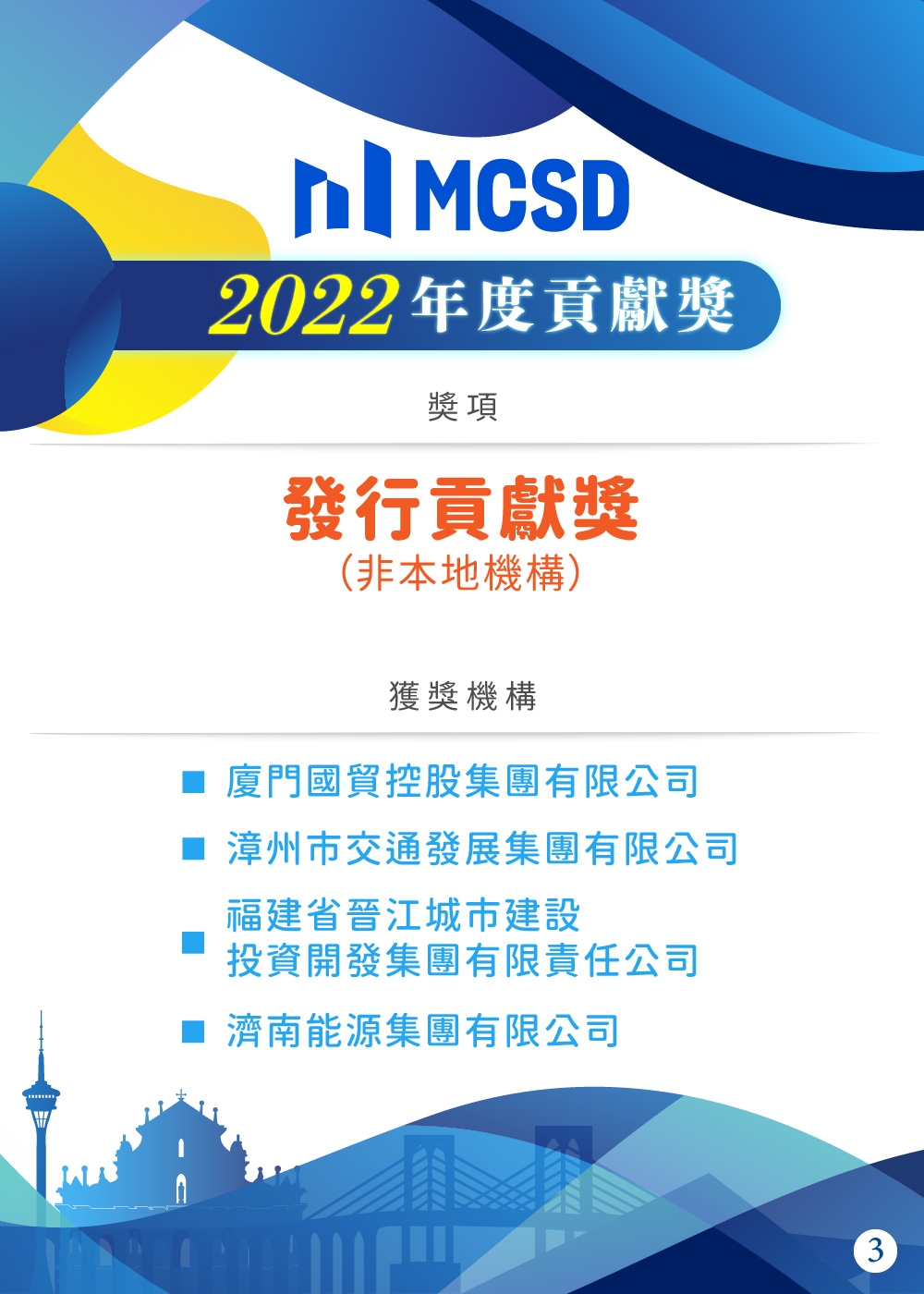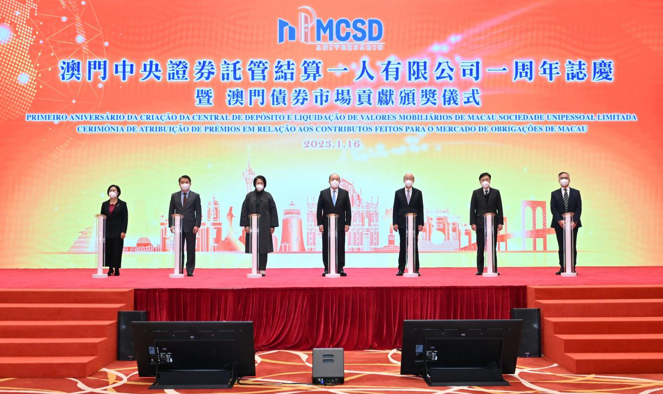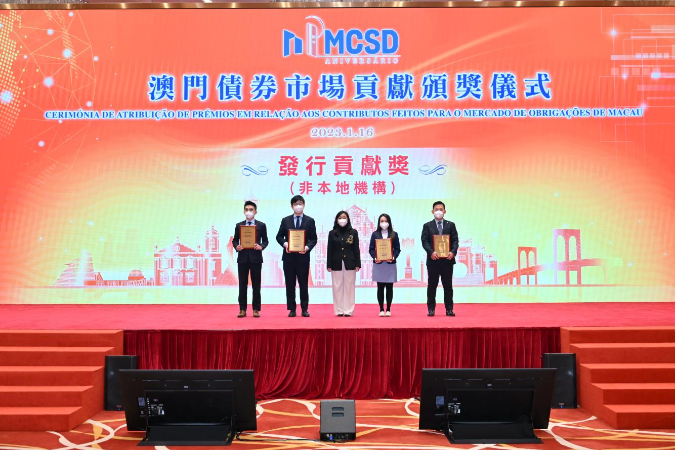 1月16日,澳門(mén)金融管理局與澳門(mén)中央證券托管結(jié)算一人有限公司(MCSD)合辦活動(dòng)慶祝MCSD成立一周年,行政長(zhǎng)官賀一誠(chéng)等嘉賓主禮?;顒?dòng)中為2022年度在澳門(mén)債券市場(chǎng)發(fā)展中作出貢獻(xiàn)的25家機(jī)構(gòu)頒獎(jiǎng),濟(jì)南能源集團(tuán)榮獲發(fā)行貢獻(xiàn)獎(jiǎng)。
