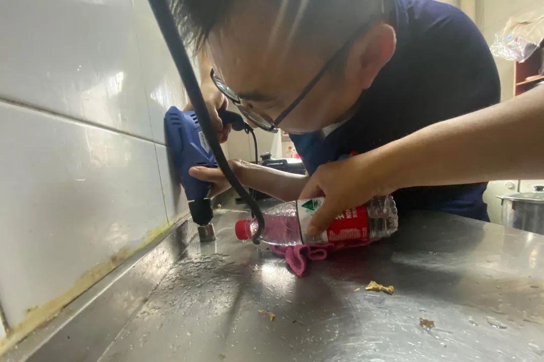 眼神聚焦、手中的鉆頭高速旋轉(zhuǎn),在一間面積不到5平方米的廚房里,苗興峰正全神貫注于臺面上的一個圓孔。別看只是一個小小的孔眼,在燃氣軟管更換工序中,卻是最難的一步。