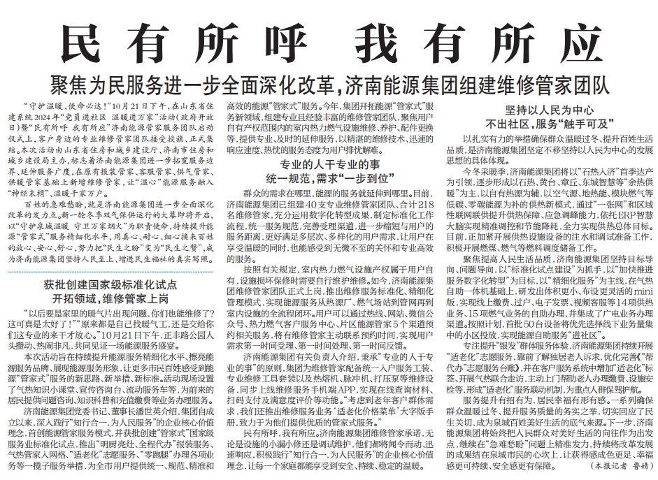 【濟(jì)南日報(bào)】民有所呼 我有所應(yīng) 聚焦為民服務(wù)進(jìn)一步全面深化改革,濟(jì)南能源集團(tuán)組建維修管家團(tuán)隊(duì)