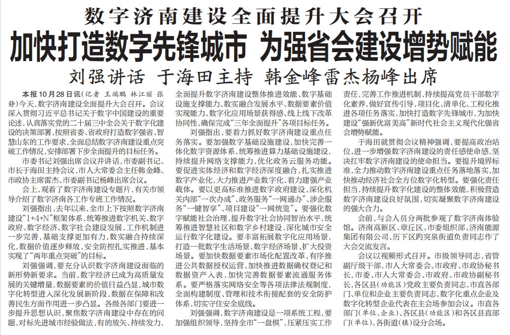 【濟南日報】數(shù)字濟南建設全面提升大會召開 加快打造數(shù)字先鋒城市 為強省會建設增勢賦能 劉強講話 于海田主持 韓金峰雷杰楊峰出席