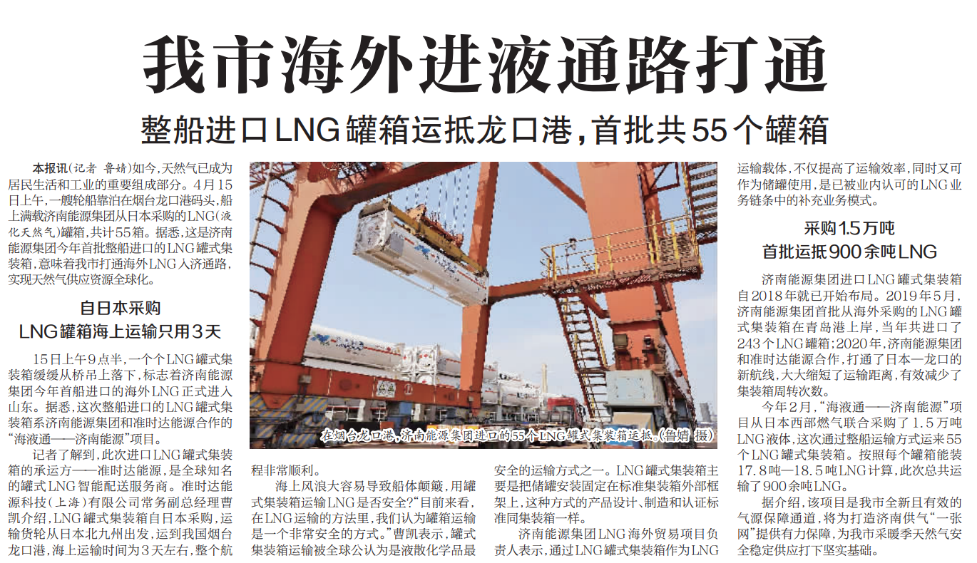 【濟(jì)南日報】我市海外進(jìn)液通路打通 整船進(jìn)口LNG罐箱運(yùn)抵龍口港,首批共55個罐箱