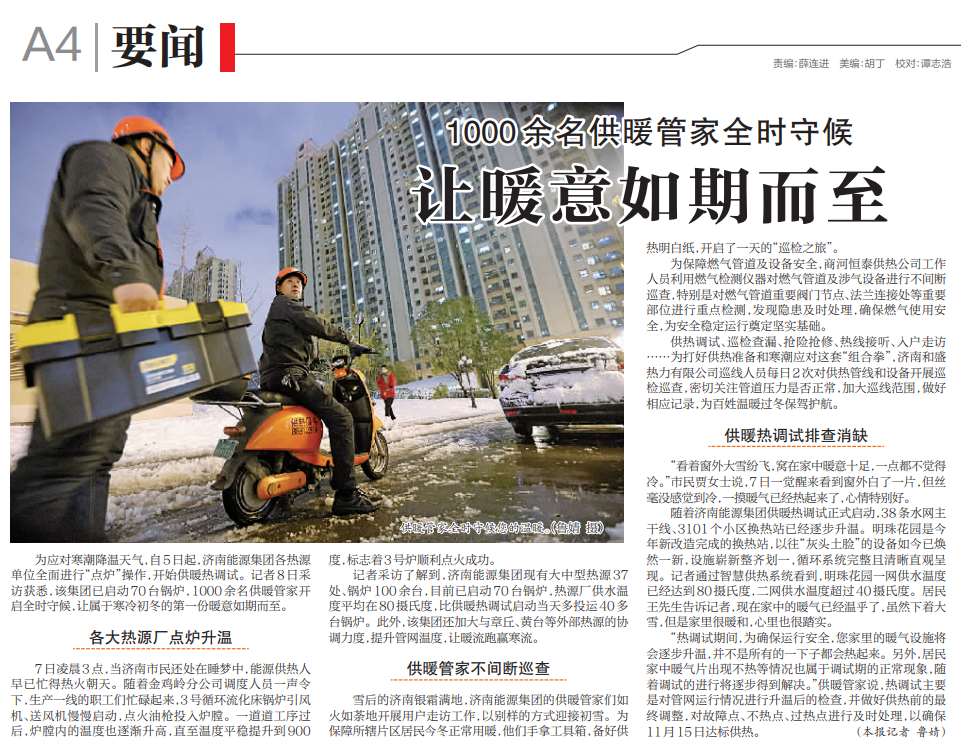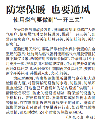 【濟南日報】1000 余名供暖管家全時守候 讓暖意如期而至 | 防寒保暖 也要通風 使用燃氣要做到“一開三關”