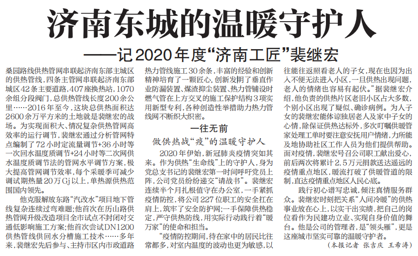 【濟南日報】濟南東城的溫暖守護人——記2020年度“濟南工匠”裴繼宏