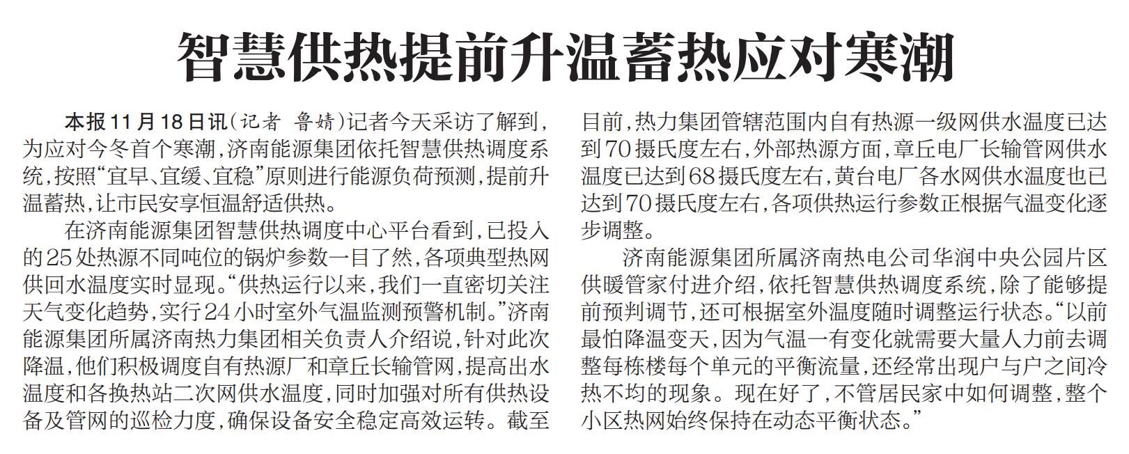 【濟(jì)南日報】智慧供熱提前升溫蓄熱應(yīng)對寒潮