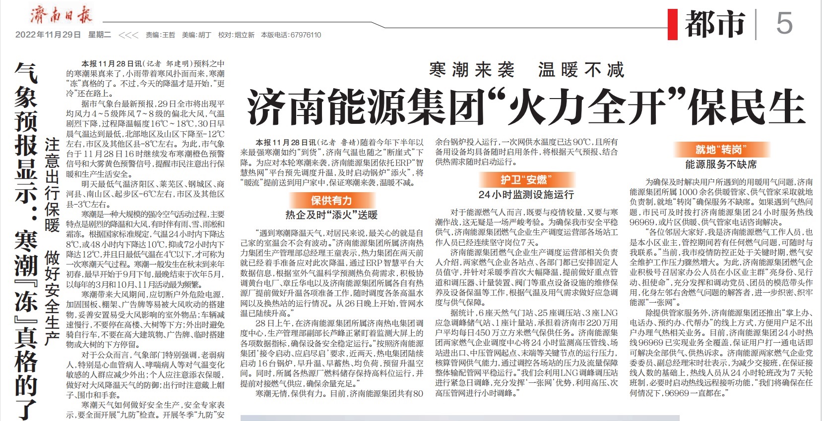 【濟南日報】寒潮來襲 溫暖不減 濟南能源集團“火力全開”保民生